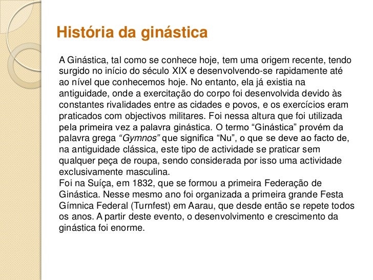 A ginástica é um conceito que engloba modalidades competitivas e não competitivas e envolve a prática de uma série de movimentos exigentes deforça, flexibilidade e coordenação motora para fins únicos de aperfeiçoamento físico e mental.